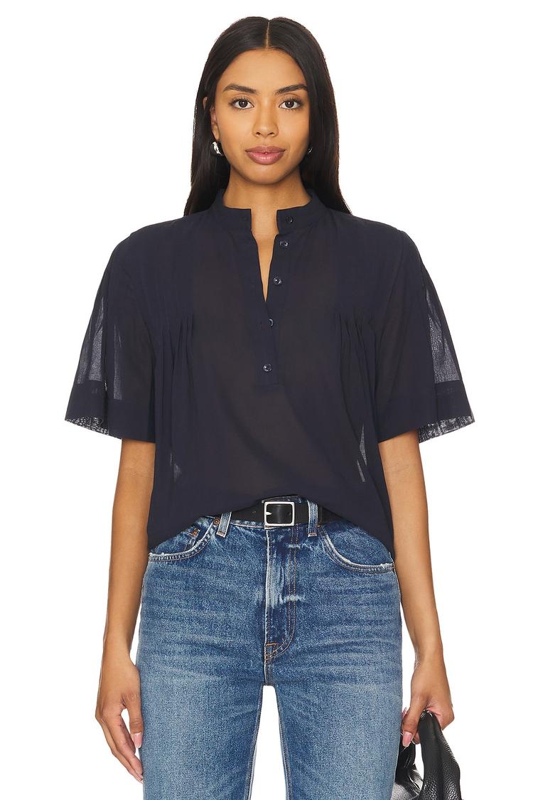 Delicate pleating adds subtle texture to this navy blouson blouse crafted in lightweight cotton for breathable comfort. The loose fit and flutter half sleeves create a relaxed silhouette, while the band collar and partial front button closure lend classic appeal. Falling to hip length, this versatile top pairs effortlessly with jeans for casual days or tailored pants for workwear and brunch outings. Its minimalist style and soft fabric make it a refined choice for spring and summer wardrobes.