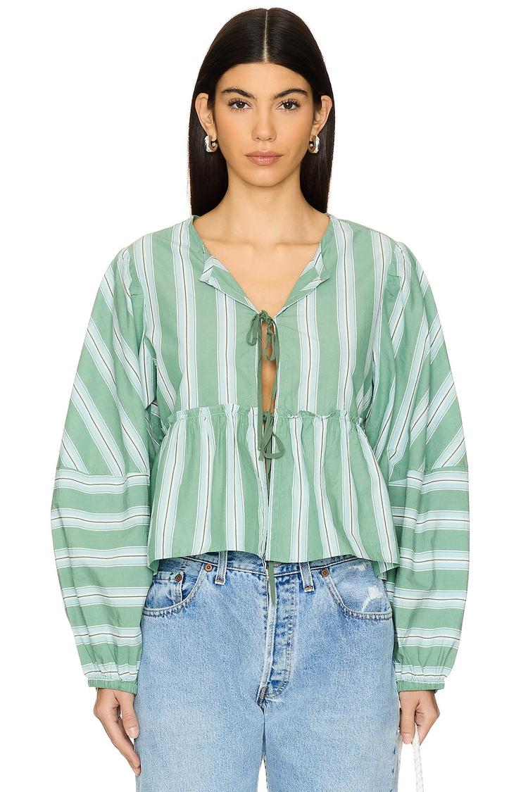 Lightweight cotton poplin and a breezy loose fit bring effortless style to this blouson blouse. Featuring a waist length silhouette with long regular sleeves finished with elasticized cuffs, it showcases a V-neckline with a charming front double tie closure. The soft light green and white all-over stripes combined with delicate ruffle detailing at the hem create a casual chic vibe perfect for spring, summer, or autumn. Ideal for casual outings, brunch dates, and everyday wear, this blouse blends comfort and bohemian flair with ease.