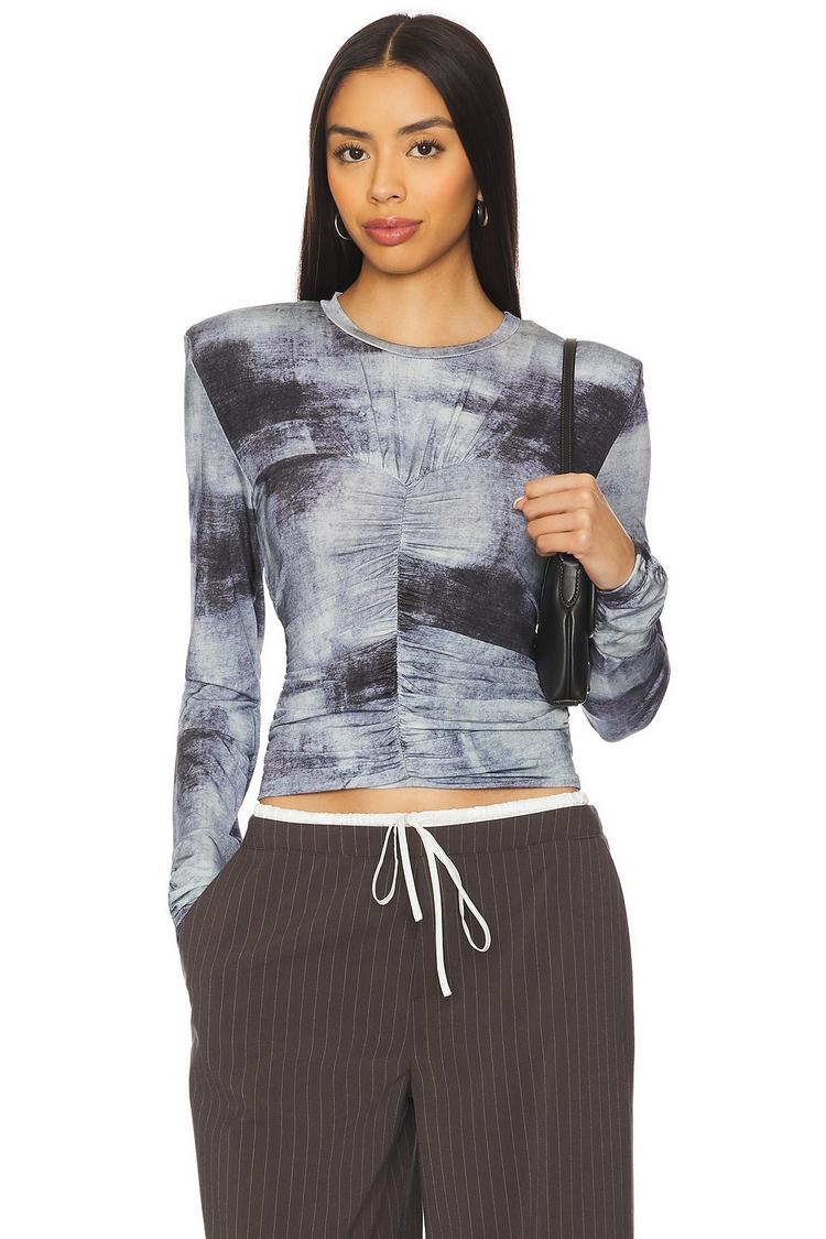 Abstract artistry meets modern tailoring in this fitted blouson top crafted from midweight slinky viscose-elastane jersey. Featuring long sleeves with ruched detailing and padded shoulders, it offers a sophisticated silhouette with a round neckline and waist-length hem. Perfect for elevating your workwear, brunch dates, or casual outings, this versatile piece blends comfort with chic style. The muted gray and black abstract print adds visual intrigue while maintaining a refined edge for business casual and everyday wear.