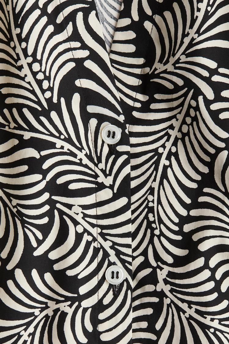 Crisp cotton poplin fabric and a relaxed blouson fit define this hip-length blouse, featuring a delicate band collar with a subtle V-shaped front opening. The three-quarter raglan balloon sleeves add an airy volume, perfect for spring, summer, and autumn days. Its abstract black and cream pattern lends a minimalist yet classic aesthetic, making it an ideal choice for casual outings, workwear, and business casual settings. The button-down front enhances versatility, while the straight hem keeps the silhouette clean and polished.