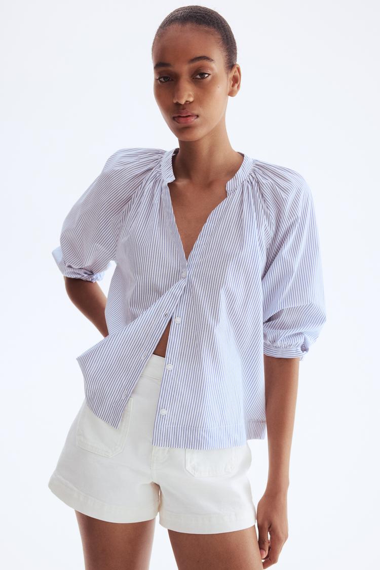 Soft poplin fabric and airy balloon sleeves create an effortlessly elegant vibe in this classic striped blouse. Featuring a relaxed fit with a flattering V-neckline and long, voluminous sleeves, it offers comfort and style for spring through autumn. The crisp white base with subtle blue stripes lends a timeless, minimalist look, perfect for casual outings, workwear, or weekend brunches. Button closure and hip-length cut complete this versatile piece designed to elevate everyday wardrobes with a refined yet easygoing silhouette.