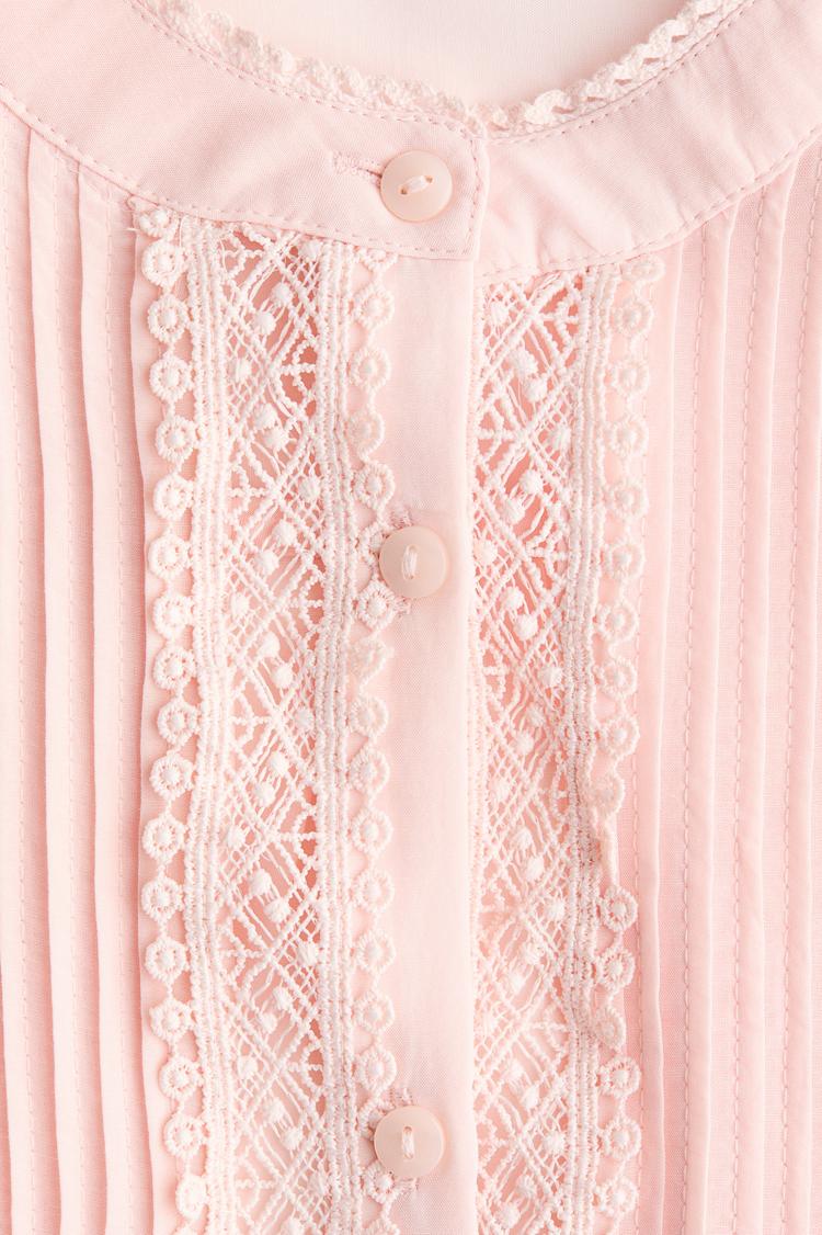 Soft light pink hues and delicate lace trim define this romantic blouson blouse. Featuring intricate pintuck pleats along the front and a classic round neckline with button closure, it offers a regular fit that balances comfort and elegance. Ideal for spring and summer, this blouse suits casual outings, workwear, and brunch occasions with its timeless, refined style.