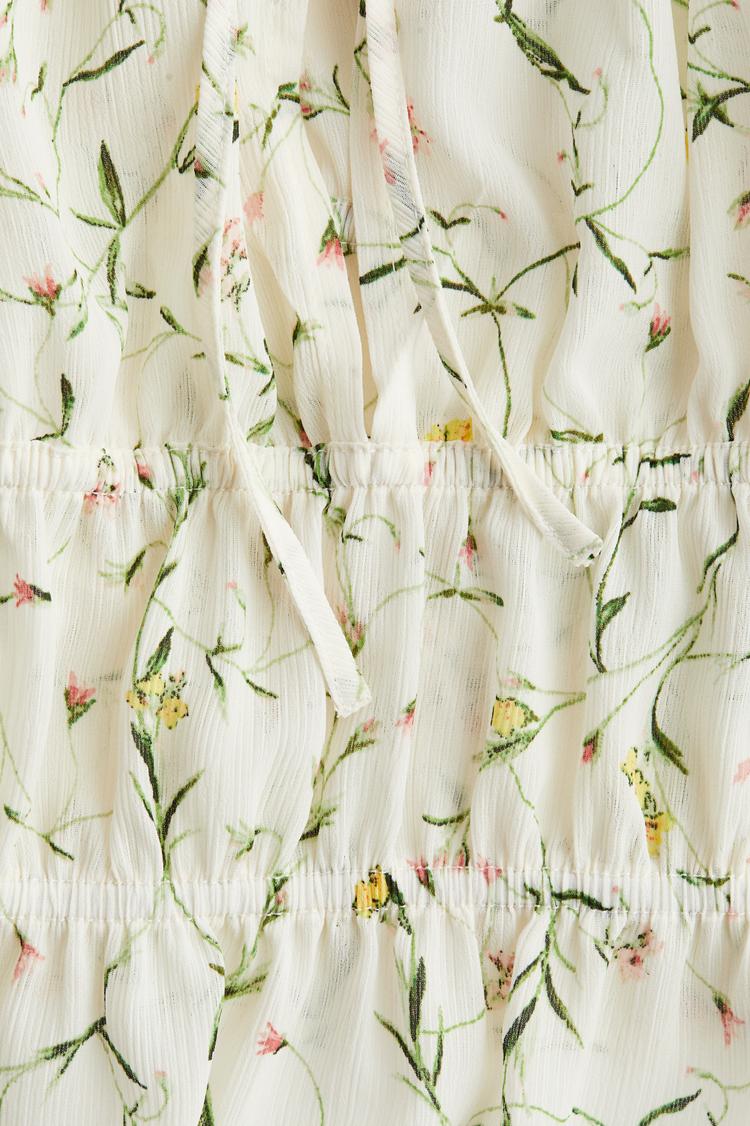 Soft crinkled cotton and a relaxed fit define this cropped blouson blouse featuring a square neckline with a delicate drawstring tie. Long balloon sleeves with elasticized cuffs and a gathered, elasticized waist create a charming silhouette, enhanced by subtle ruffle details at the hem and bodice. The all-over floral print in gentle greens, yellows, and pinks on an off-white base brings a fresh spring vibe. Ideal for casual outings, brunches, or everyday wear, this versatile blouse offers breathable comfort and effortless style.