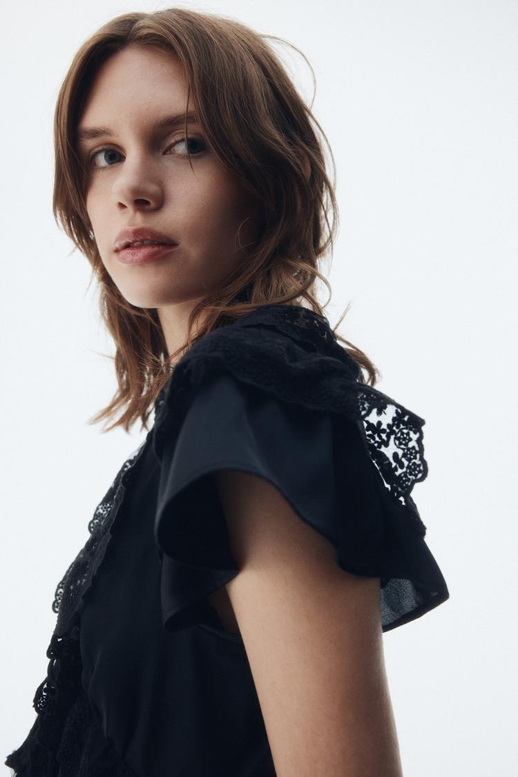 Soft matte black satin with delicate lace trim and flounce sleeves create a romantic, elegant blouson silhouette. Featuring a relaxed fit and round neckline, this hip-length blouse offers versatile styling options for casual outings, brunch dates, or evening occasions. The intricate ruffles and lace details add subtle texture and feminine charm, making it a chic choice for sophisticated day-to-night looks.