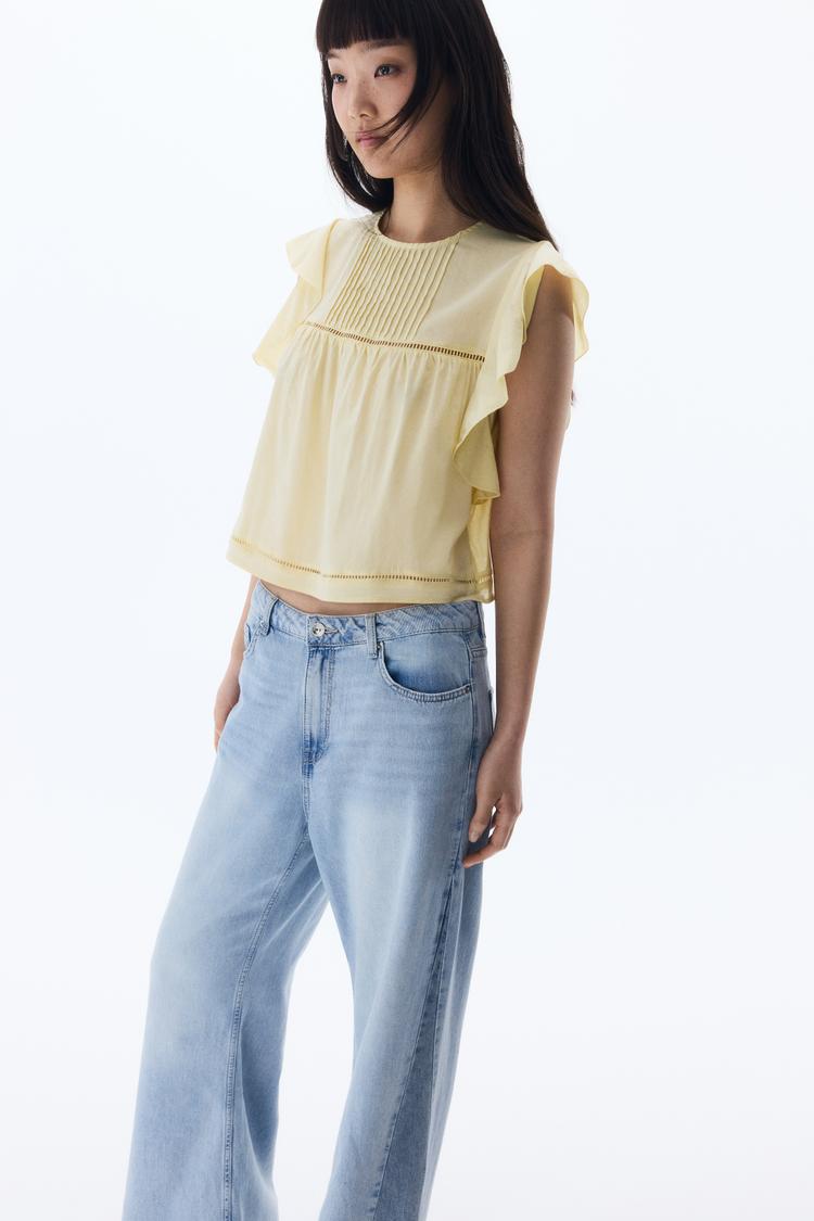 Soft matte light yellow cotton-viscose blend fabric forms this romantic blouson with flutter sleeves and a round neckline. Pintuck pleats at the chest and delicate lace trim at the bodice and hem add gentle texture. The sleeveless design and loose fit create an airy, comfortable silhouette perfect for spring and summer. A keyhole back closure with a button enhances its subtle charm. Ideal for casual outings, brunch dates, or everyday wear, this blouse combines effortless style with feminine details.