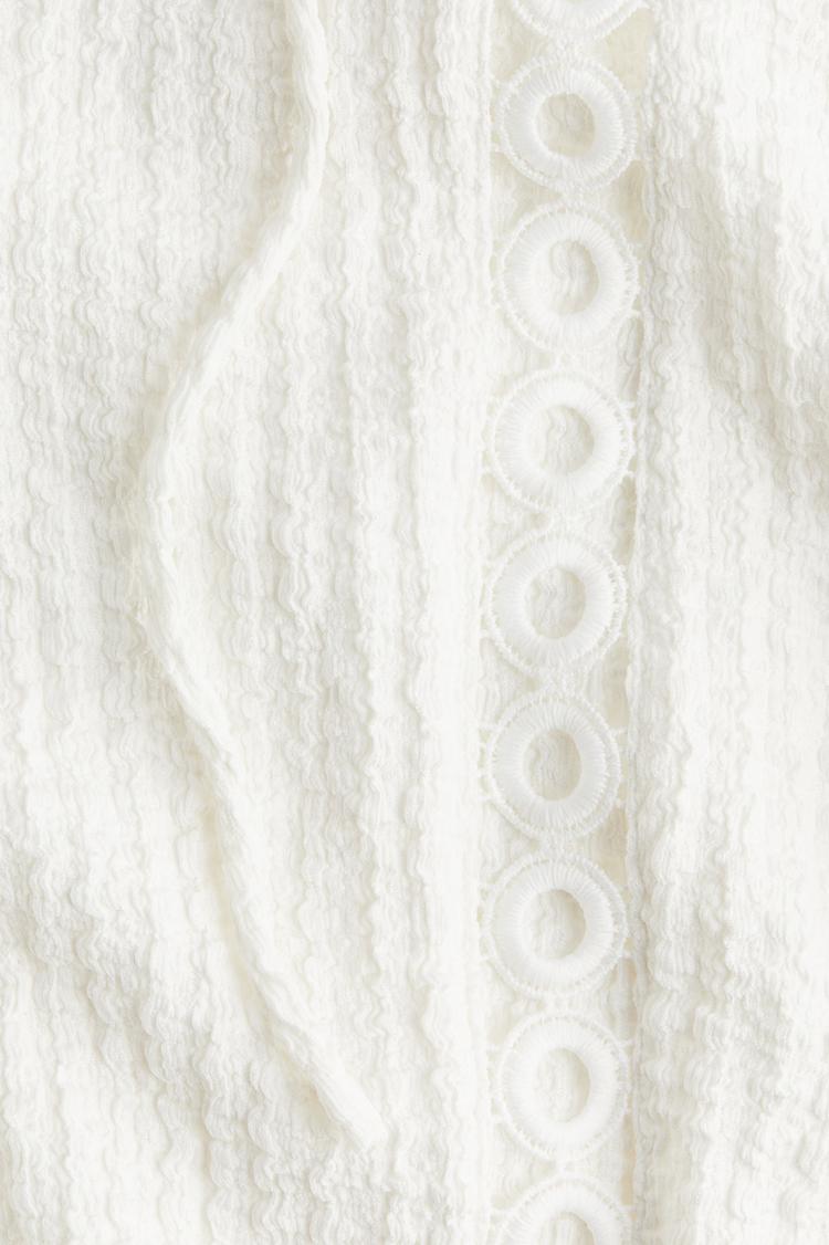 Soft crinkled jersey fabric and delicate lace trims define this loose-fitting blouson blouse, featuring a round neckline with a V-shaped front opening secured by narrow ties. The long sleeves with elastic cuffs and elasticated hem create a relaxed silhouette perfect for spring through autumn. Its off-white hue and intricate lace insets on the front and sleeves lend a bohemian, casual chic vibe ideal for everyday wear, brunch dates, or laid-back casual occasions.