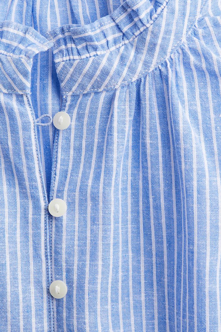 Loose-fit blouse in a woven linen and cotton blend. Ruffled collar with gathers at front and back, opening at front with buttons, and flutter sleeves.