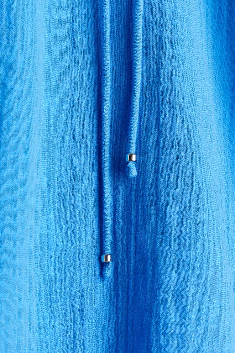 Soft cotton muslin fabric and a relaxed blouson silhouette define this matte blue blouse, featuring a low quilted stand collar and a flattering V-shaped front opening with delicate tie-up closures. The long balloon raglan sleeves with narrow cuffs add volume and a breezy feel, while the rounded hem enhances the hip-length cut. Ideal for casual outings, workwear, or brunch, this loose-fit blouse delivers comfort and classic style across spring, summer, and autumn seasons.