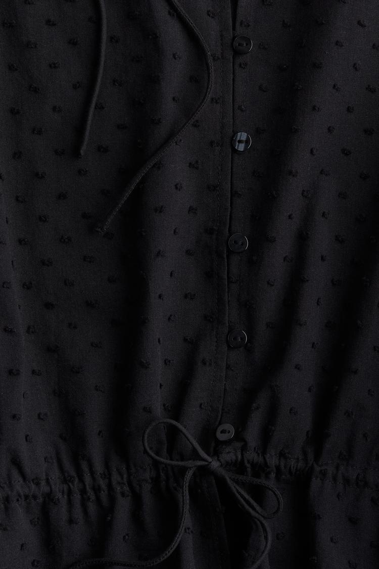 Blouse in airy woven cotton. Round neckline with extra-narrow ties, buttons at front, and voluminous, 3/4-length puff sleeves. Drawstring at waist and a flared peplum.