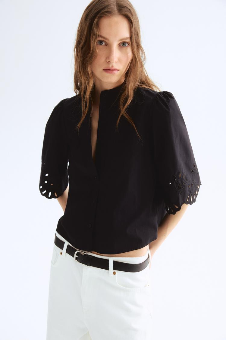 A chic black cotton blouse that elevates everyday style with effortless ease. This front-button top features a crisp, woven cotton body and an elegant band collar. Elbow-length puff sleeves showcase tone-on-tone eyelet embroidery and delicate scalloped cuffs, while the straight hem keeps the look clean and versatile. The relaxed fit drapes beautifully, making it ready to pair with white denim for a fresh daytime look or with tailored pants for a polished workwear vibe. Timeless, feminine, and endlessly wearable—perfect for brunch dates, casual Fridays, or weekend city strolls.