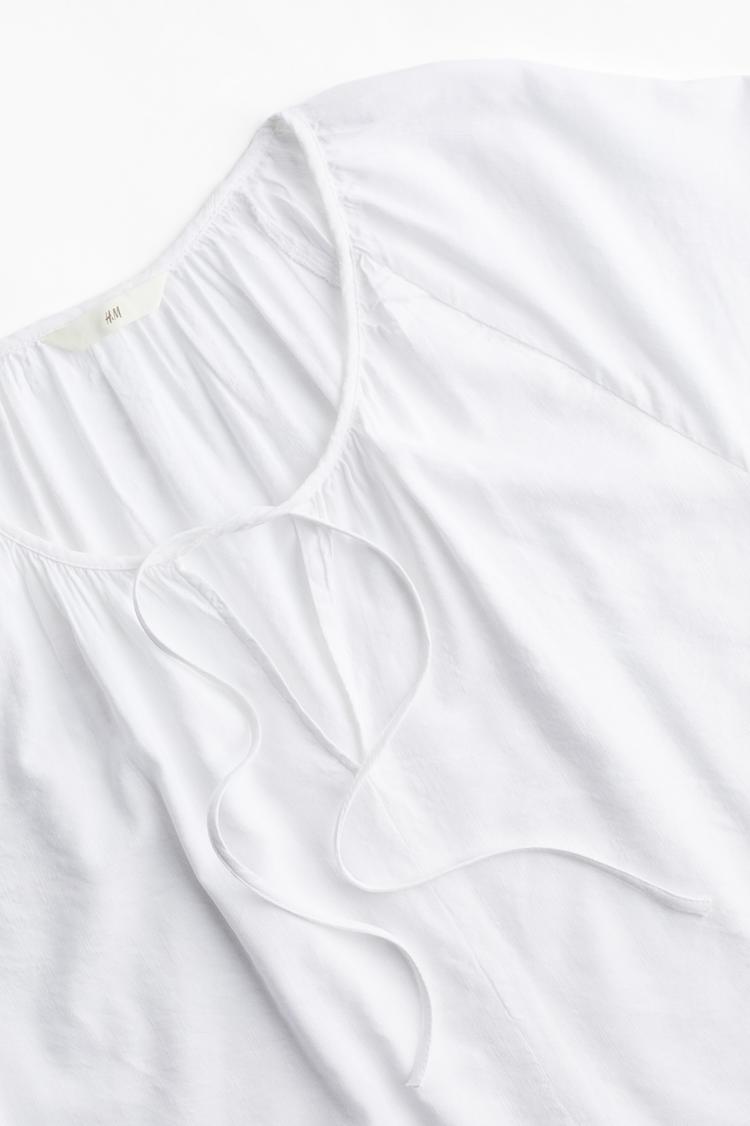 Soft cotton fabric and a relaxed, loose fit make this blouson blouse a versatile essential. Featuring a round neckline with gentle gathers and a V-shaped front opening finished with delicate tie-up details, it offers an airy feel perfect for spring and summer. The short raglan sleeves add subtle character while maintaining comfort. Ideal for casual outings, brunches, or everyday workwear, this hip-length blouse blends minimalist style with classic charm for effortless layering and all-day wear.