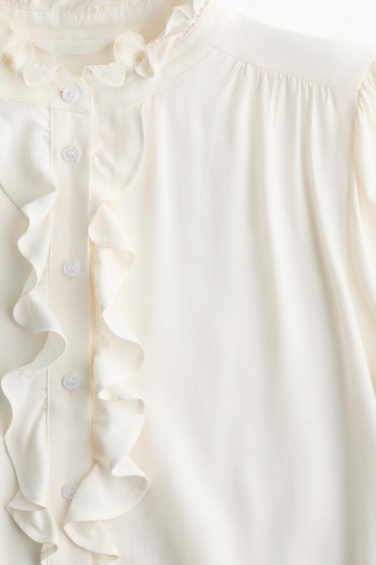 Softly flowing viscose meets timeless elegance in this cream-colored blouson blouse featuring a romantic ruffle collar and front detailing. The V-neckline and long regular sleeves create a relaxed yet polished silhouette, perfect for workwear, brunch, or a casual date night. Its hip-length cut and classic button closure add versatility, making it a refined choice for spring and autumn wardrobes.