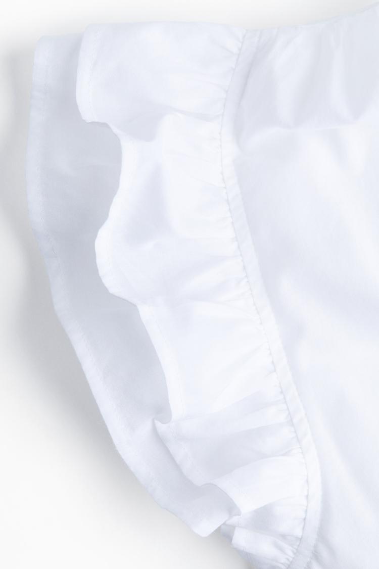 Soft cotton fabric with a refined matte white finish highlights this wrap blouse featuring a deep V-neck and flounce sleeves trimmed with delicate ruffles. Its regular fit and hip-length hem make it effortlessly versatile for casual brunches, vacation days, or everyday wear. The romantic ruffle detailing along the sleeves and front adds a subtle feminine touch to this classic minimalist piece.