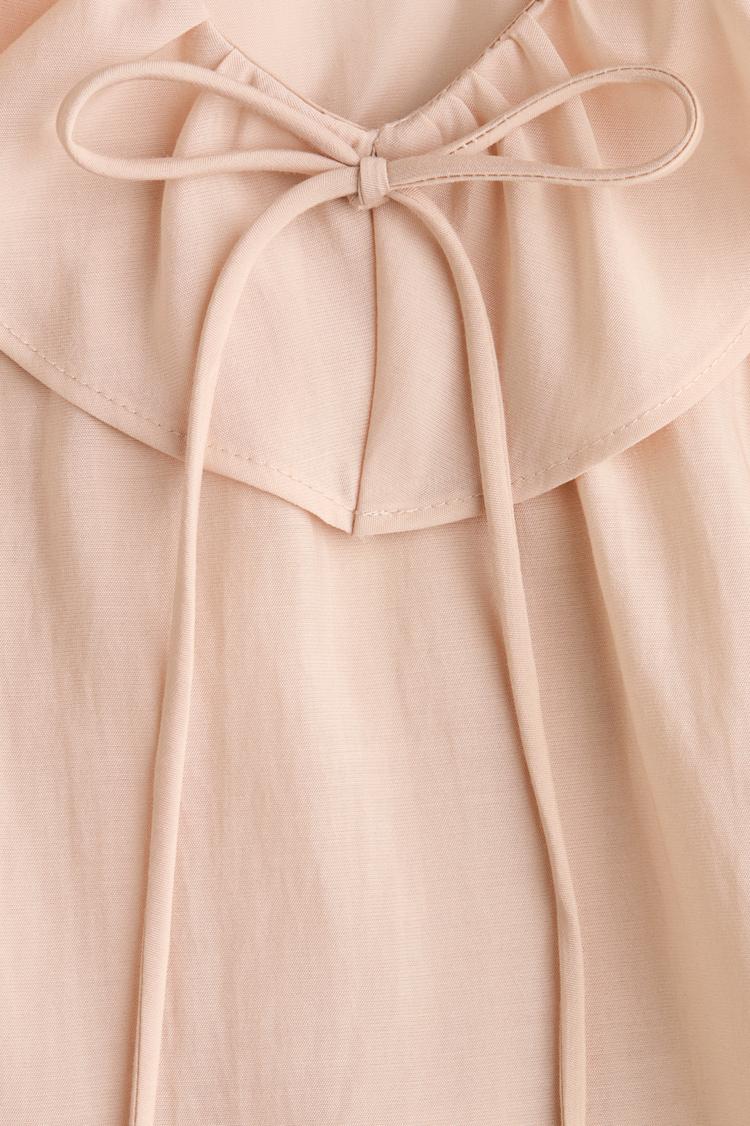 Soft matte blush fabric and layered ruffle trims create a romantic and elegant silhouette in this blouson blouse. Featuring a classic collar, long flounce sleeves, and a loose fit that falls to hip length, it offers a graceful drape and comfortable wear. Button closures enhance the timeless appeal, making it versatile for casual outings, workwear, and brunch gatherings. The gentle ruffle details across the front, back, and sleeves add a feminine touch, perfectly complementing transitional spring and autumn wardrobes.