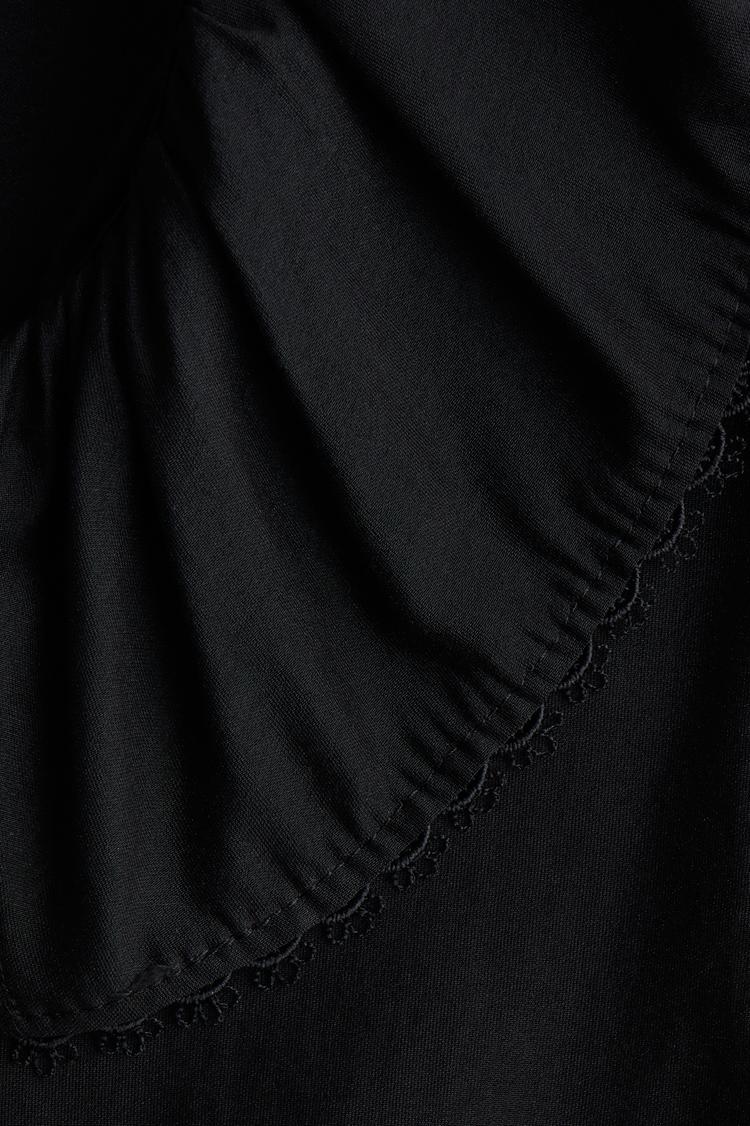 Soft matte black fabric and a relaxed blouson fit define this chic blouse. Featuring a flattering V-neckline and half-length cuffed sleeves, it is finished with a delicate ruffle detail along the front and a tie-up closure that adds subtle charm. The waist-length cut offers versatile styling for casual outings, brunch with friends, or everyday wear during spring and summer. This minimalist, casual chic top pairs effortlessly with a variety of bottoms for a polished yet easygoing look.