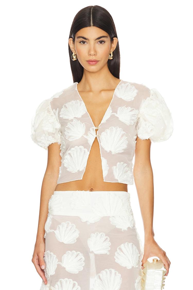 Lightweight organza fabric and a fitted cropped silhouette define this romantic blouson blouse. The delicate seashell pattern in off-white adds a whimsical touch, while the voluminous half puff sleeves create an airy, feminine vibe. Featuring a singular front button closure and a flattering V-neckline, this top is perfect for spring and summer days. Ideal for casual outings, brunch dates, or a vacation wardrobe, its sheer texture and playful design bring effortless charm to your warm-weather looks.