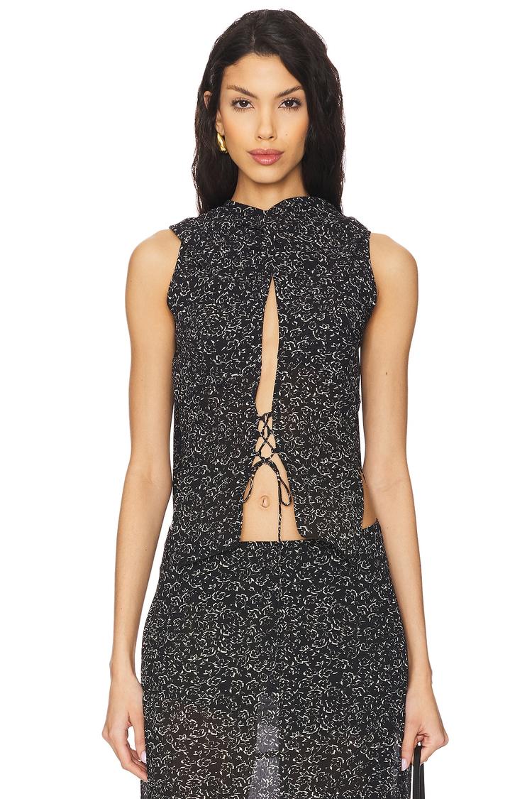 A matte black chiffon shell features a high neck with an attached scarf and a striking front keyhole cut-out secured by ribbon tie-up closure. The sleeveless, slim-fit silhouette falls to hip length, highlighting edgy back keyhole details with a loop button closure. This chic and trendy blouse is perfect for warm spring and summer days, easily transitioning from casual brunches to night outs with its sexy, modern appeal.