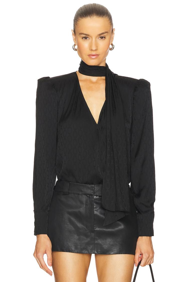 Lightweight satin fabric and a regular fit define this elegant blouson blouse with a surplice neckline. The hip-length silhouette is enhanced by padded shoulders for a structured look, while the detachable bow scarf detail at the neck adds a versatile, sophisticated touch. Perfectly suited for workwear, business casual events, brunches, or date nights, this matte black blouse combines classic style with modern functionality for all-weather wear.