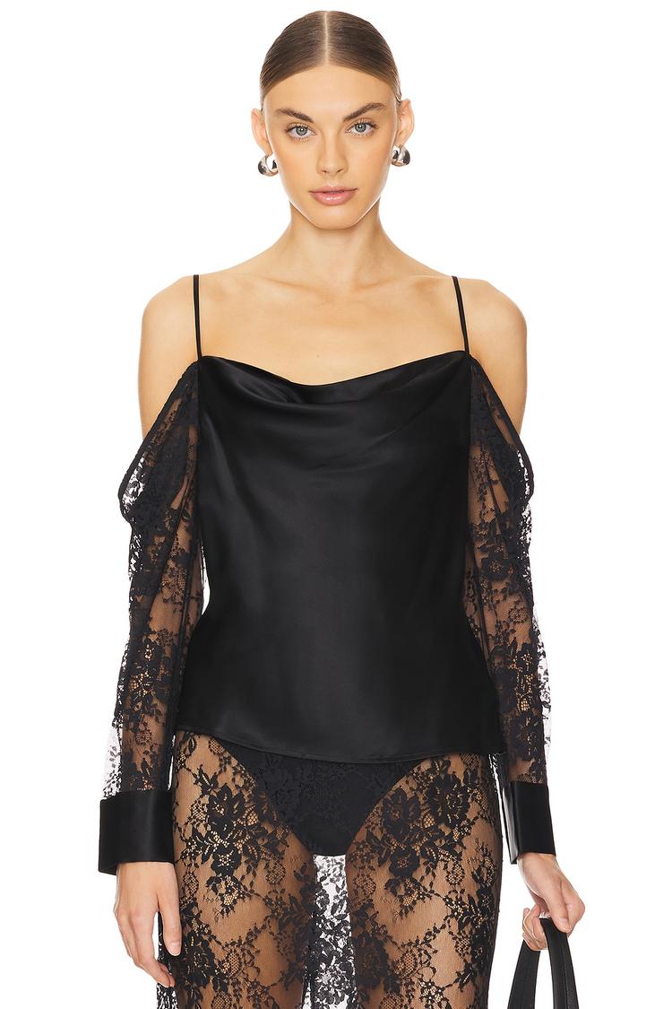 Soft satin silk blends effortlessly with delicate lace in this elegant camisole featuring a flattering cowl neck and cold-shoulder long lace sleeves. The slim fit and hip length silhouette enhance sophistication, while adjustable shoulder straps and button cuffs add refined detailing. Perfect for spring to autumn wear, this chic piece suits date nights, casual outings, or night events with its sexy yet polished vibe.