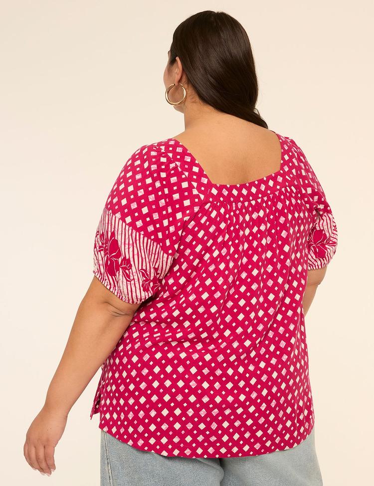 Bright pink viscose fabric with an all-over geometric print brings vibrant energy to this classic blouson blouse. Designed with a flattering square neckline and cuffed half sleeves, it offers a regular fit that’s perfect for plus sizes. The hip-length hem and covered back create a versatile silhouette ideal for casual outings, everyday wear, or brunch dates. Soft, smooth fabric enhances comfort and ease, making it a stylish yet practical choice for warm spring and summer days.
