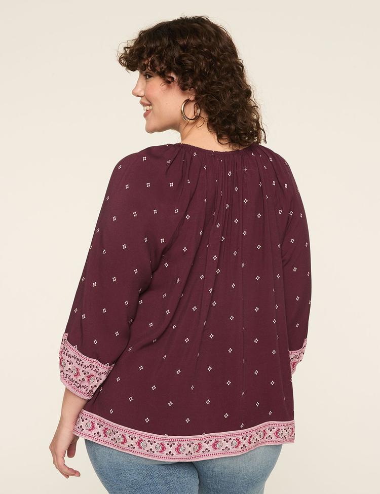 Feel-good sophistication in a rich maroon geo print top. This Lane Bryant Swing blouse drapes softly over curves with a relaxed, flowy silhouette, handcrafted in breathable rayon challis. It features a split-neck popover and 3/4 blouson sleeves with covered elastic cuffs for a flattering balloon shape. All-over geometric motifs in white pair with pink border trim at the cuffs and hem for a subtle, refined contrast. Pullover ease makes it a versatile pick from desk to dinner, layering effortlessly with a blazer or denim. An easy, chic staple you’ll reach for again and again.
