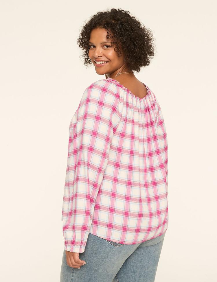 Available in Plus Size You've got desk-to-dinner dates, and we've got just the top to take you through your whole day. This Swing-fit popover comes in a pretty plaid, with some, stretchy elastic at the neckline and sleeves. FIT: SWING. Our just-right full swing perfectly flatters your curves. Front Length (On Body): 28.5" Standard length FEATURES: Square neck Covered elastic at neckline and cuffs FABRIC: Twill. Structured cotton that keeps its shape, with the perfect amount of stretch for all-day comfort. Machine Wash Cold With Like Colors; Only Non-Chlorine Bleach When Needed; Tumble Dry Low; Cool Iron If Needed 56% Cotton/44% Rayon Item Number #413557 Imported Plus Size Top". Plus Size Swing Square-Neck Popover Blouse, in Magenta Plaid, 12, Women's, Lane Bryant