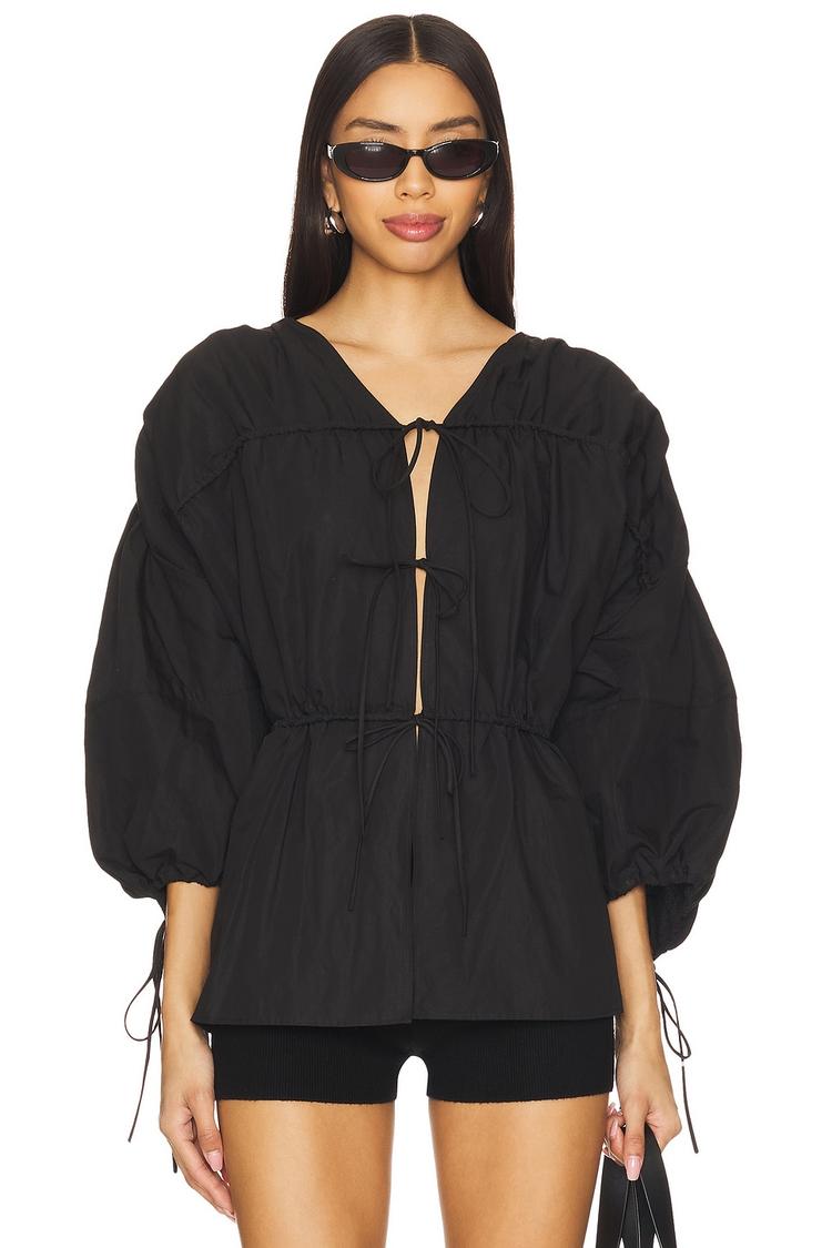 Soft cotton with a subtle wrinkled texture brings relaxed sophistication to this blouson blouse featuring a flattering V-neck and adjustable tie-up front. The hip length silhouette paired with voluminous three-quarter balloon sleeves and drawstring cuffs offers a modern, casual chic vibe ideal for spring through autumn. Perfectly suited for casual days, brunches, or everyday wear, its relaxed fit and functional drawstring details ensure comfort and style in versatile settings.