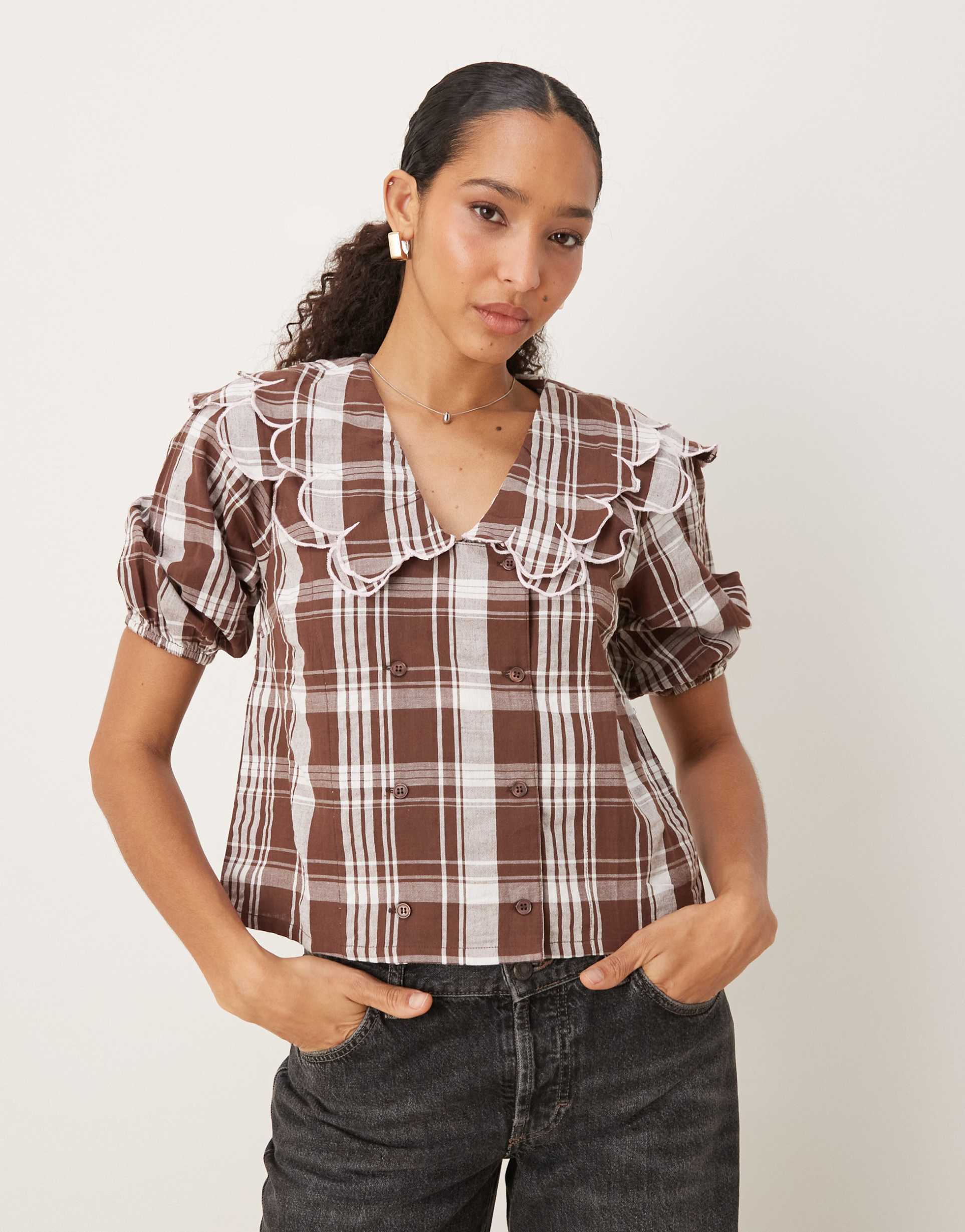 Soft cotton fabric and a regular fit define this classic blouson blouse adorned with an oversized scallop collar and puffed half sleeves. The beige plaid checkered pattern gives a timeless appeal, while the front button placket adds subtle detailing. Ideal for casual outings, brunches, or everyday wear, this hip-length blouse combines comfort with a touch of vintage-inspired charm. The scallop trim on the collar enhances its feminine look, making it a versatile addition to your spring, summer, or autumn wardrobe.