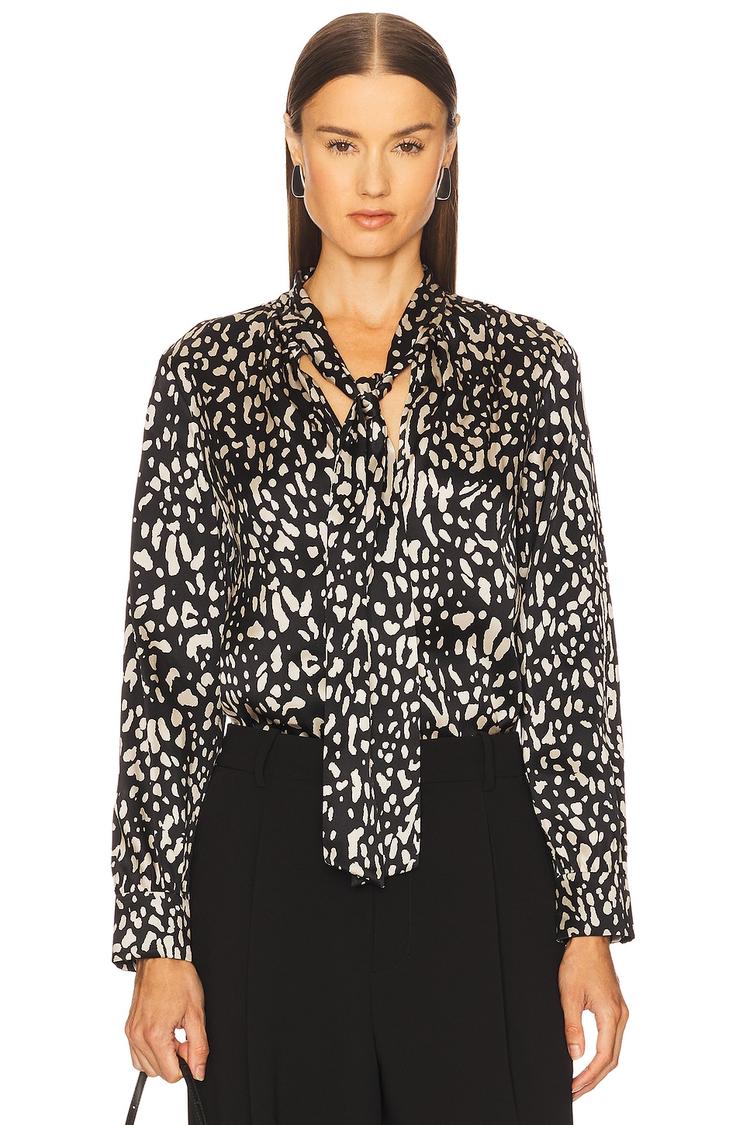 Crafted from luxurious silk, this relaxed-fit blouson blouse features an all-over abstract print in black and off-white. Its classic V-neckline and long regular sleeves offer a sophisticated silhouette, while the hip-length hem and pullover style provide effortless elegance. Perfect for workwear, business casual settings, or a refined date night, this blouse blends timeless style with versatile comfort for all seasons.