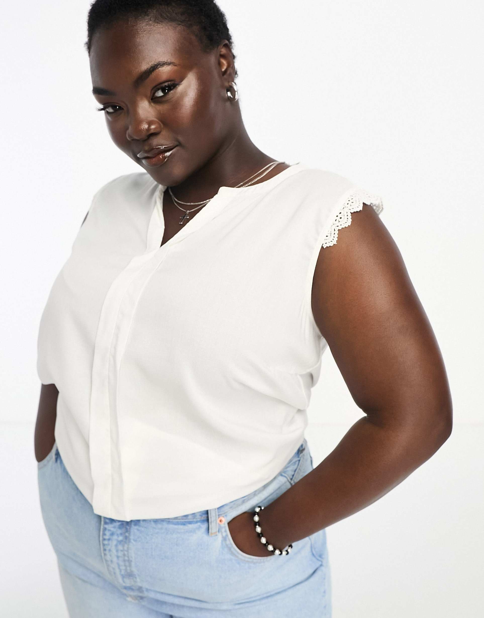 ONLY CURVE V-NECK BLOUSE WITH CROCHET TRIM IN WHITE