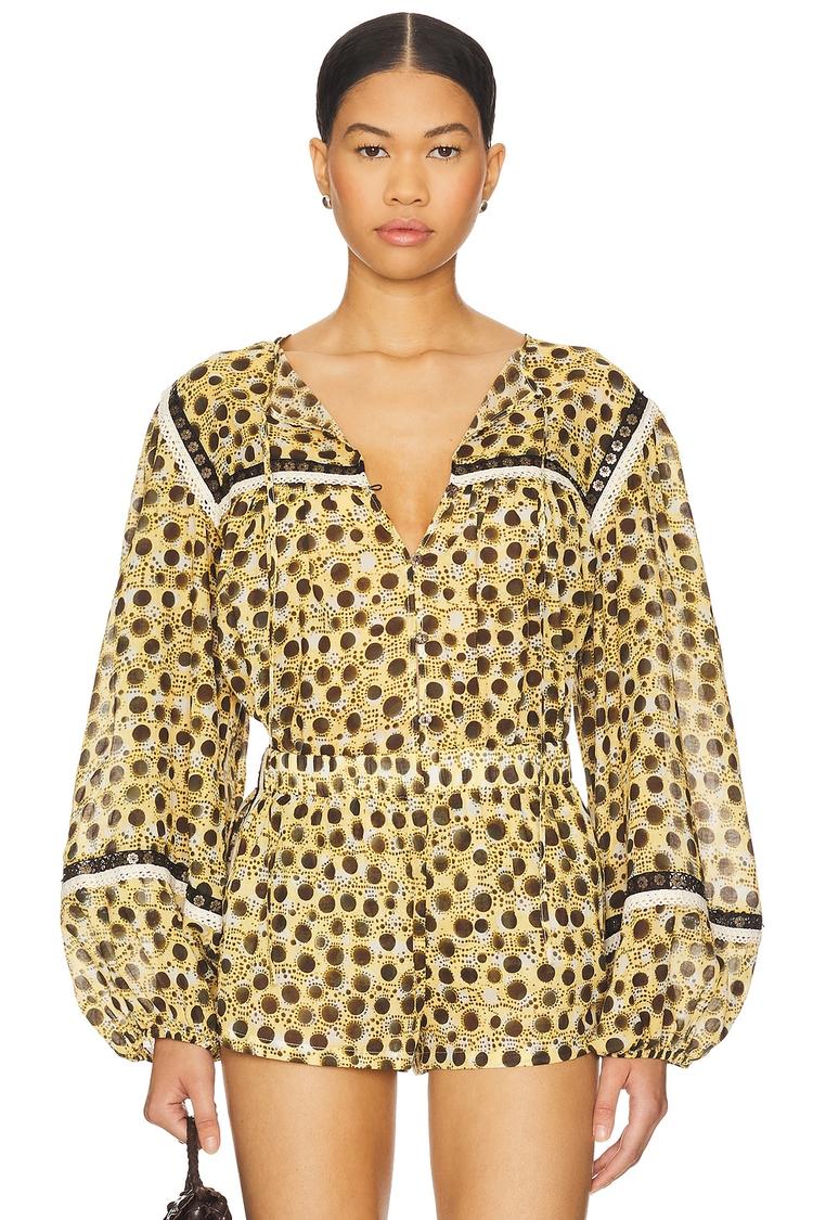 Lightweight cotton fabric and a loose blouson silhouette create an effortlessly elegant look with this hip-length blouse. The V-neckline and bishop sleeves enhance its romantic appeal, while the delicate beaded floral detailing and lace trim add refined texture. Front button loop closure with an additional tie accent provides subtle charm and adjustability. Ideal for casual outings, brunch dates, or relaxed date nights, this blouse blends bohemian style with versatile comfort for spring and summer wardrobes.