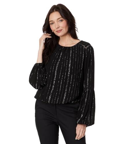 Effortless glam meets everyday polish in this black lurex-striped blouse. The long blouson sleeves, crewneck, and waist-length silhouette create a relaxed, versatile fit, while shimmering lurex threads trace vertical stripes for a subtle metallic glow. A delicate back keyhole adds a refined detail to this shirtward staple. Lightweight yet eye-catching, it pairs beautifully with tailored trousers for work or with denim for a chic weekend look. Ready for travel days, casual outings, or evenings out—this Tommy Hilfiger top blends comfort with polished shine, season after season.