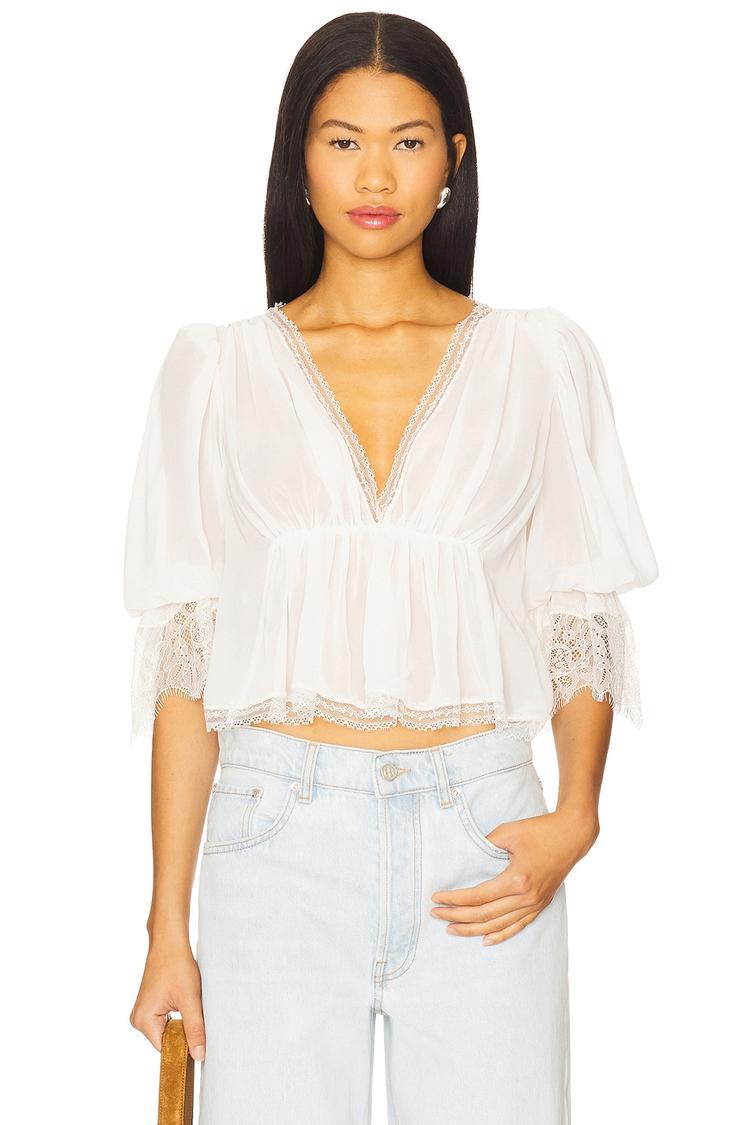 Soft chiffon fabric with delicate lace trim and ruffled details define this romantic cropped blouson blouse. Featuring a relaxed fit and elbow-length blouson sleeves, the V-neckline enhances its feminine appeal. The lightweight sheer white fabric gives an airy, effortless vibe perfect for spring and summer. This versatile piece suits casual outings, brunch dates, and relaxed evenings, combining bohemian charm with chic elegance. The pullover style and cropped length make it easy to pair with high-waisted denim or skirts for a stylish look that transitions seamlessly from day to night.
