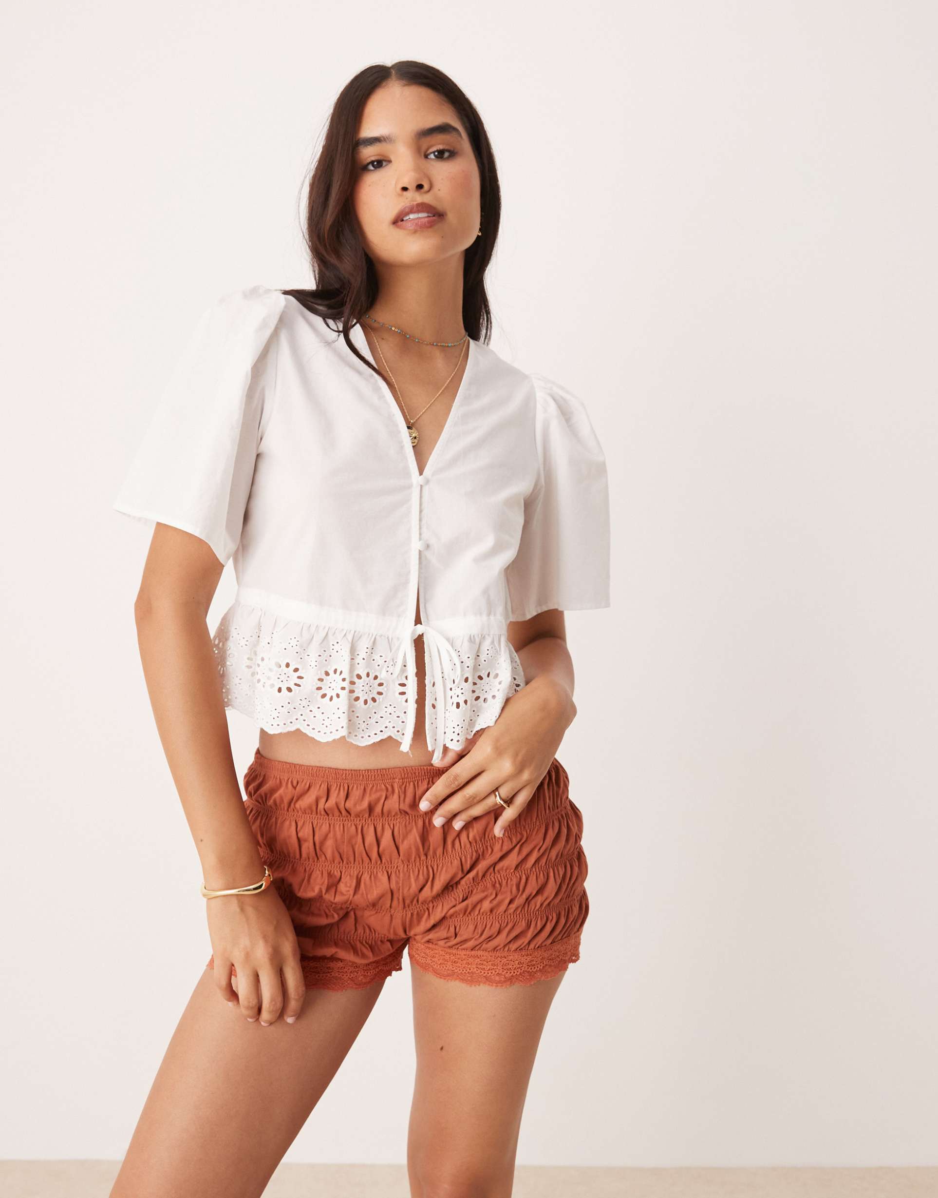 VILA TIE FRONT EYELET DETAIL BLOUSE IN WHITE