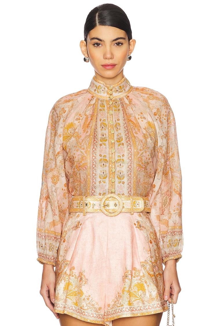 Delicately patterned in a soft matte light peach hue, this blouson blouse features a high neck and billowing long balloon sleeves. Its loose fit and hip-length hem offer an effortlessly elegant silhouette, enhanced by subtle ruffle details along the front and sleeves. Crafted from lightweight fabric, it is ideal for spring and summer days. This romantic blouse is perfect for casual outings, brunch dates, or vacation wear, combining bohemian charm with refined elegance.