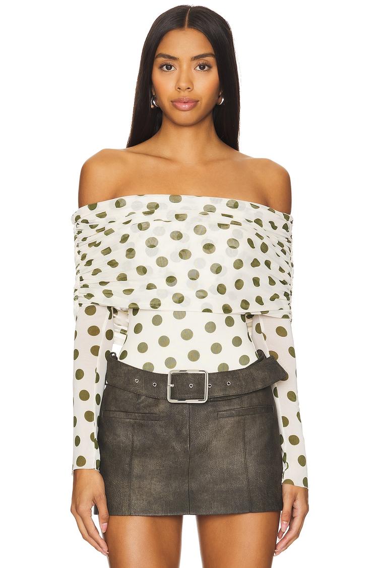 Delicate mesh fabric and an off-shoulder neckline create a striking silhouette in this chic bodysuit. Featuring long sleeves and an all-over olive polka dot print on a crisp white base, this slim-fit piece combines trendy appeal with wearable comfort. The snap button closure ensures practicality while the thong back delivers a sleek finish. Ideal for casual outings, date nights, and stylish evenings, it embodies modern sophistication and versatile charm.