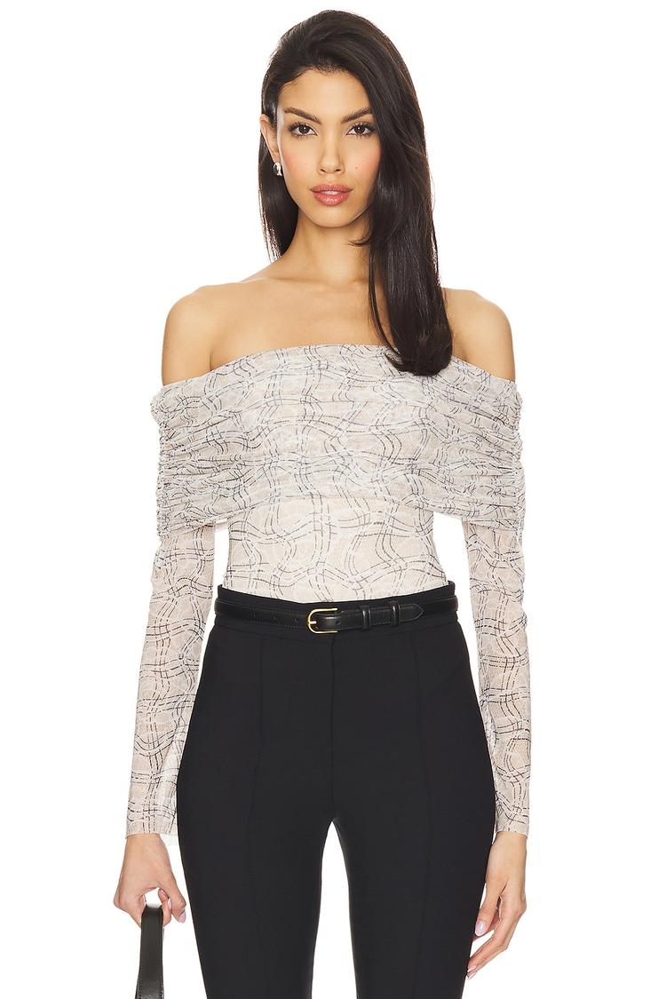 Delicate off-shoulder styling and a foldover neckline define this fitted bodysuit crafted from midweight geometric mesh fabric. The long sleeves and ruched sides add a flattering touch, while the snap gusset closure ensures ease of wear. Its cropped length and modern silhouette make it a versatile choice for casual outings, night outs, or date nights. The striking black geometric pattern on matte white fabric enhances its trendy appeal, perfect for spring through autumn seasons.
