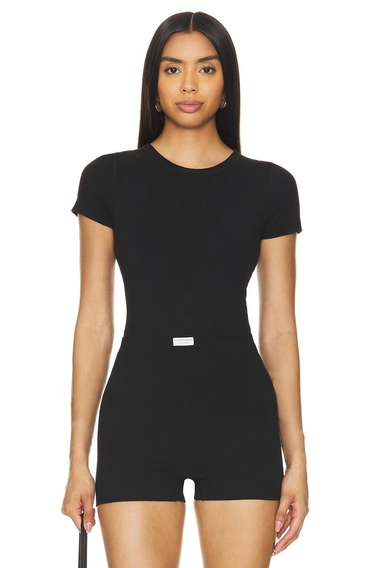 Sleek and form-fitting, this black bodysuit crafted from a cotton-nylon-elastane blend offers a clean, minimalist aesthetic. Featuring a classic crew neck and half sleeves, its ribbed texture adds subtle dimension while ensuring comfort and flexibility. The button gusset closure and thong back provide practical wearability and a smooth silhouette. Perfect for casual outings, street style looks, or everyday wear, this fitted bodysuit pairs effortlessly with jeans or skirts, making it a versatile staple for all seasons.