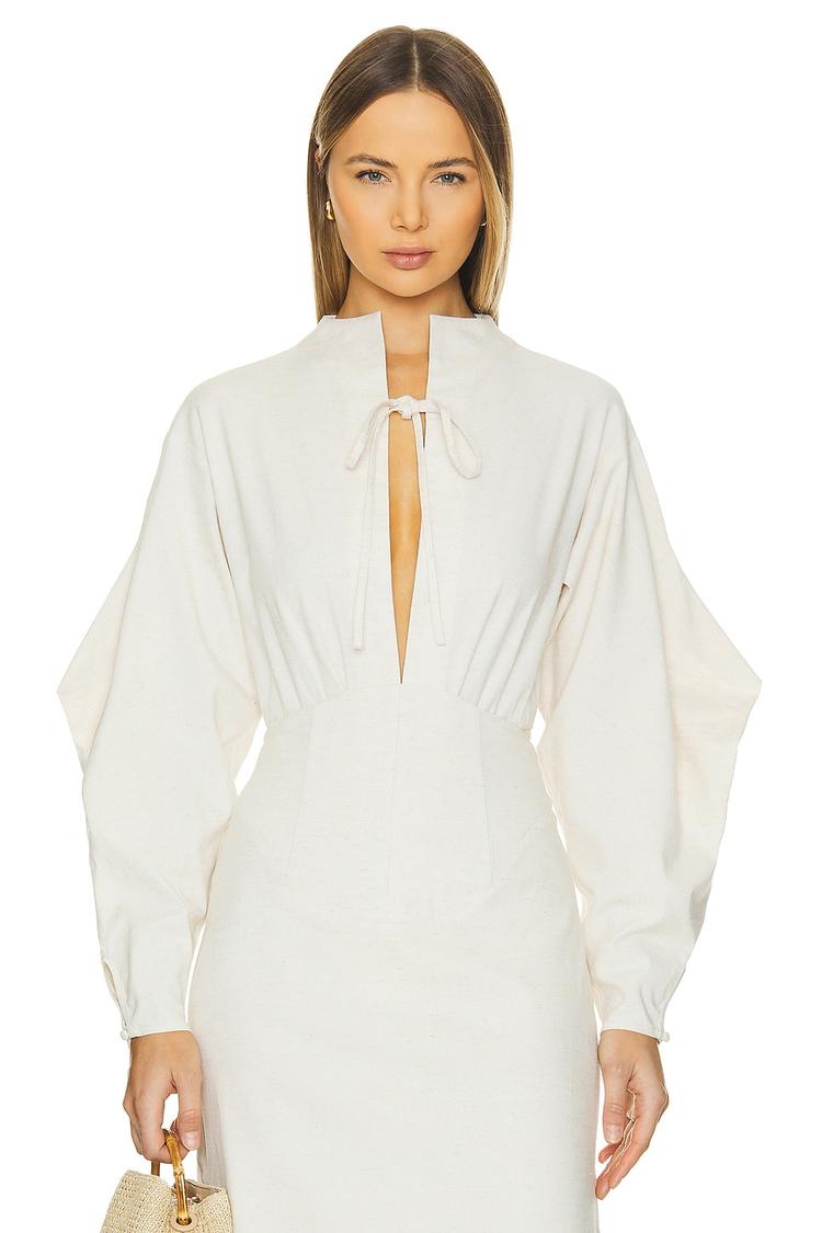 Soft cream rayon-linen blend forms this fitted bodysuit featuring elegant blouson long sleeves and a chic stand collar. The cropped length and front tie detail add a modern, sophisticated edge while the snap button gusset ensures comfort and functionality. Perfect for casual outings, brunch dates, or evening events, this versatile piece blends breathable fabric with a polished silhouette to elevate your seasonal wardrobe effortlessly.