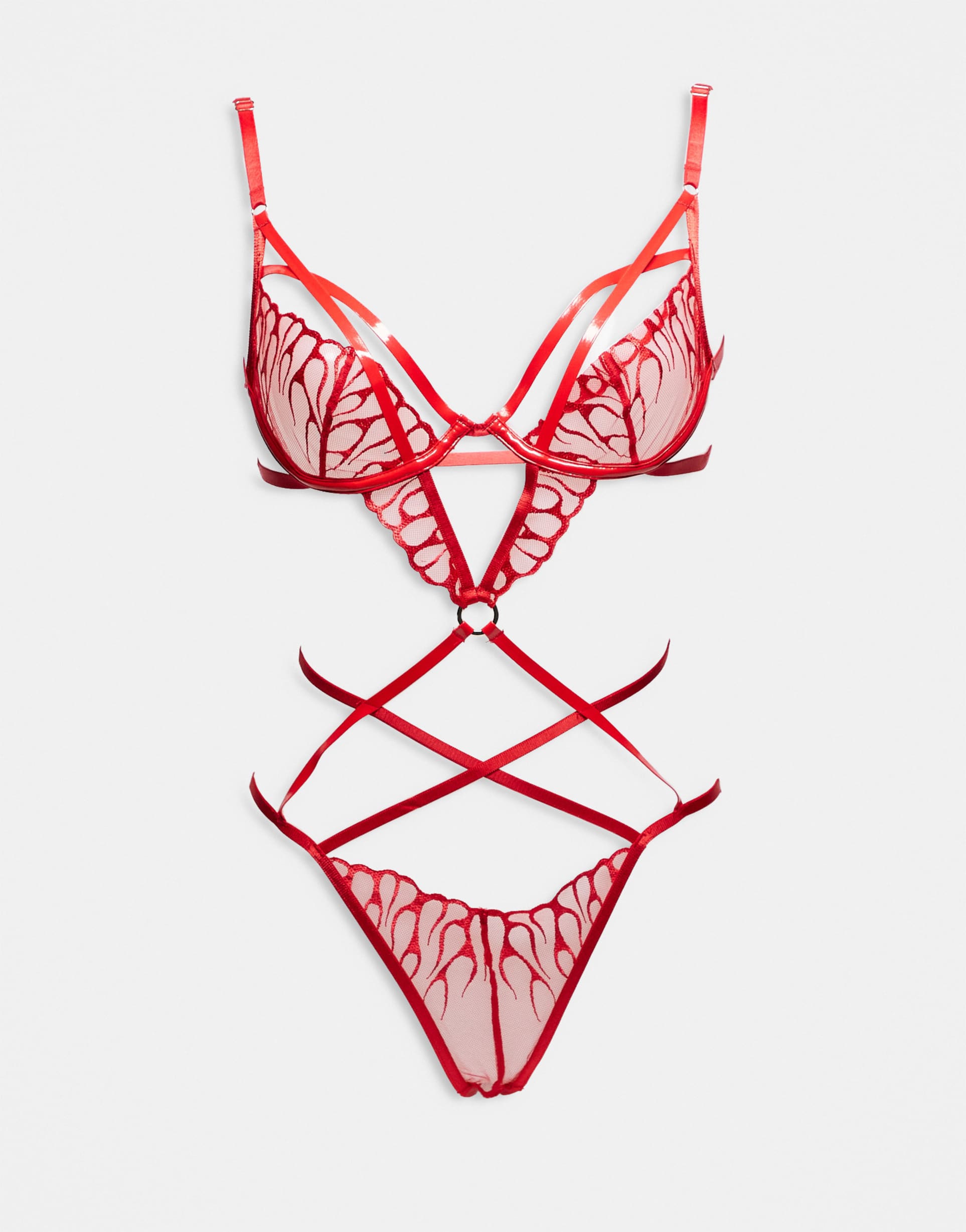 Strappy and sultry, this close-fit bodysuit in vibrant red features delicate lace cups with underwire support and adjustable straps for a perfect fit. Crafted from a polyester-polyamide blend, it offers both comfort and allure with its crotchless design and hook-and-eye closure. Ideal for intimate moments, this cropped bodysuit brings a sexy edge to sleepwear and date night wardrobes, blending delicate fabric with a daring silhouette.