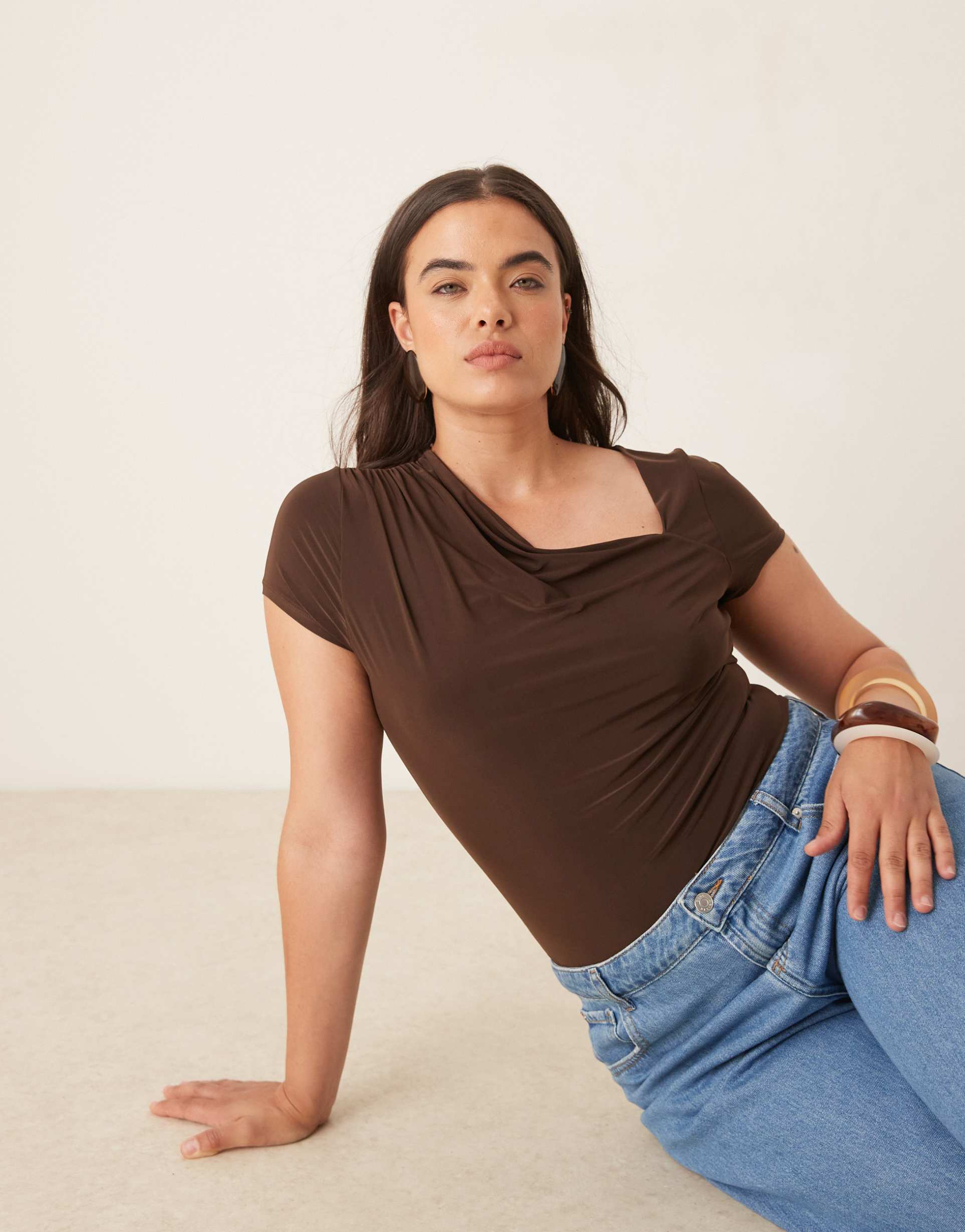 ASOS DESIGN CURVE SLINKY SHORT SLEEVE BODYSUIT WITH ASYMMETRIC NECKLINE AND DRAPING IN CHOCOLATE