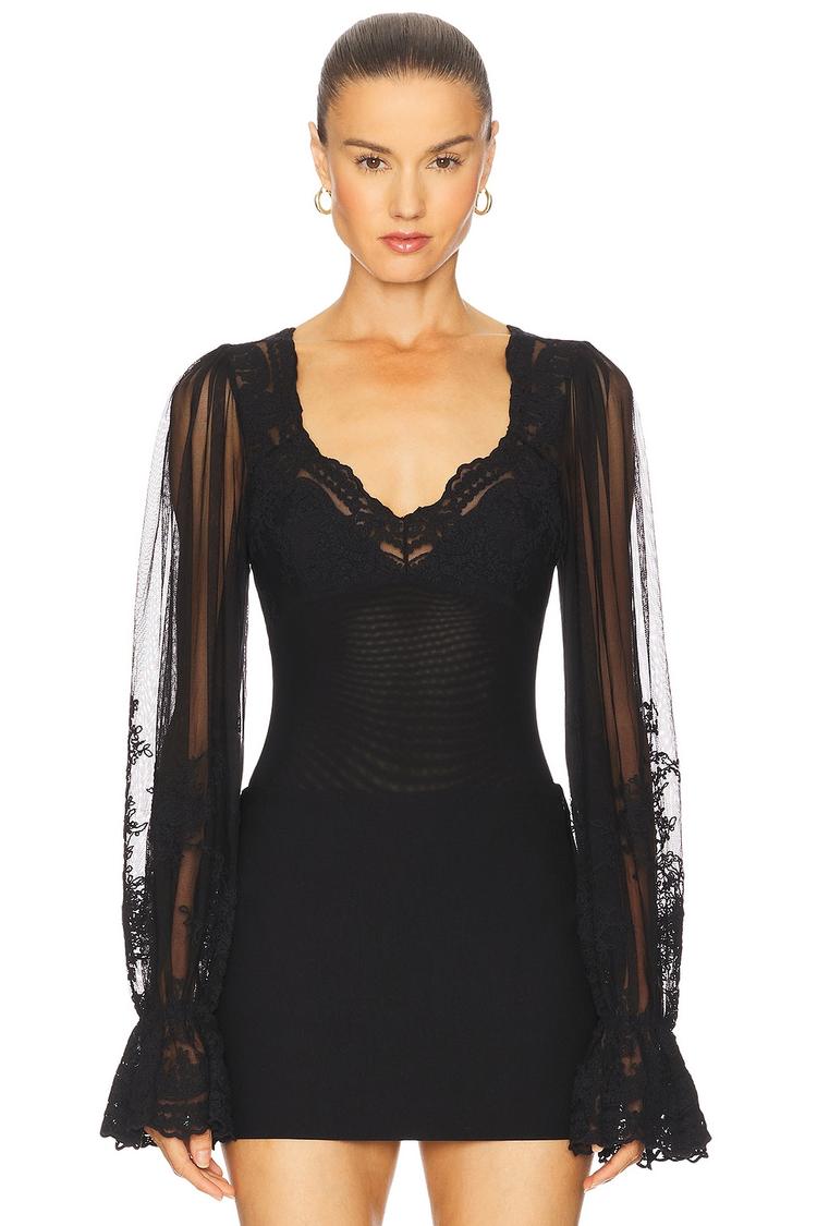 Delicate embroidery and sheer long sleeves define this fitted black bodysuit crafted from midweight mesh fabric. The flattering V-neckline and bikini back with gusset snap closure combine sensuality and elegance, making it a standout piece for date nights, cocktail parties, or girls' nights out. Its semi-sheer construction adds an alluring touch while maintaining sophistication, perfect for those seeking a chic, sexy look that transitions effortlessly across occasions.
