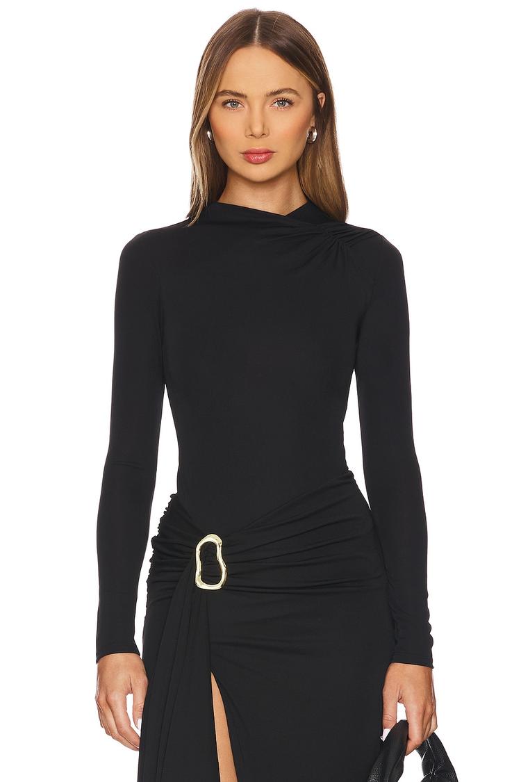 Sleek and modern, this fitted bodysuit in matte black combines a chic mock neck with long regular sleeves for a polished silhouette. Crafted from a midweight slinky polyester-elastane blend, it offers comfortable stretch and shape retention. Subtle ruching at the shoulders adds a refined design detail, while the hidden back zipper ensures a smooth finish. Versatile for casual wear, workwear, or a night out, this minimalist piece embodies sophisticated style and ease.