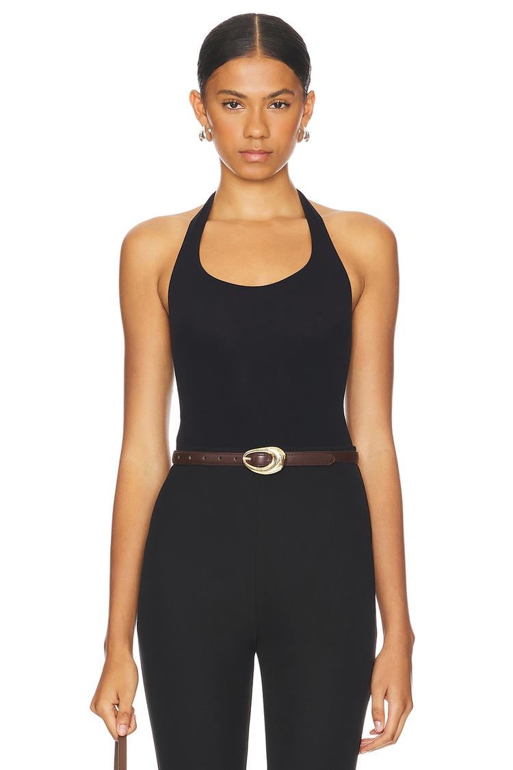 Sleek and fitted, this matte black halter neck bodysuit offers a minimalist silhouette crafted from a smooth nylon-elastane jersey blend. Its sleeveless, strapless styling and cropped length ensure a versatile foundation piece perfect for layering or standalone wear. The snap gusset closure adds convenience, making it ideal for everyday wear, travel, or casual work environments. Embrace timeless comfort with this modern essential that pairs effortlessly with high-waisted trousers or skirts for a polished yet relaxed look.
