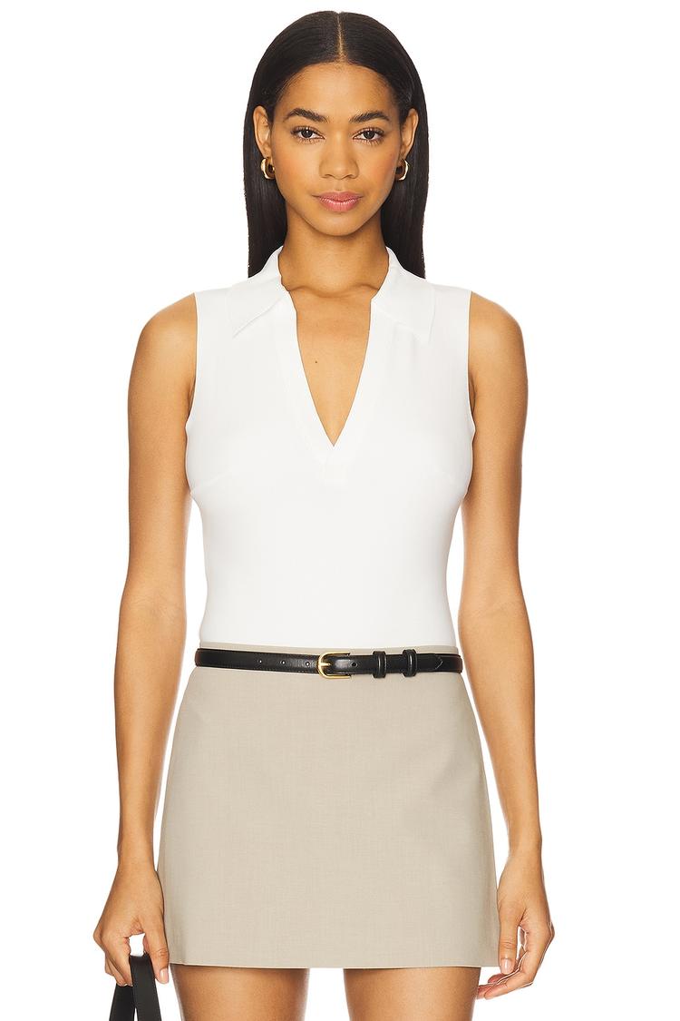 A sleek white bodysuit crafted from lightweight, stretchy nylon and elastane jersey with a cotton lining for comfort. Its fitted silhouette features a timeless V-neckline and sleeveless strapless styling, perfect for layering or wearing alone. The snap gusset closure ensures a secure fit, while the semi-sheer fabric adds a subtle, modern edge. Ideal for casual days, business casual settings, and workwear, this minimalist bodysuit blends classic elegance with contemporary comfort for versatile wardrobe styling.