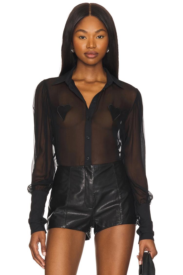 Delicately crafted from lightweight silk chiffon, this black bodysuit features long balloon sleeves and a classic collar for a sophisticated silhouette. The slim fit enhances the figure while embroidered buttoned cuffs add subtle elegance. Its sheer design offers a daring, sexy edge perfect for date nights, girls' nights, or night outs. The partial front button and snap closure ensure a sleek, polished look. Ideal for spring through autumn, this chic bodysuit pairs effortlessly with high-waisted shorts or skirts, delivering modern allure with a refined touch.
