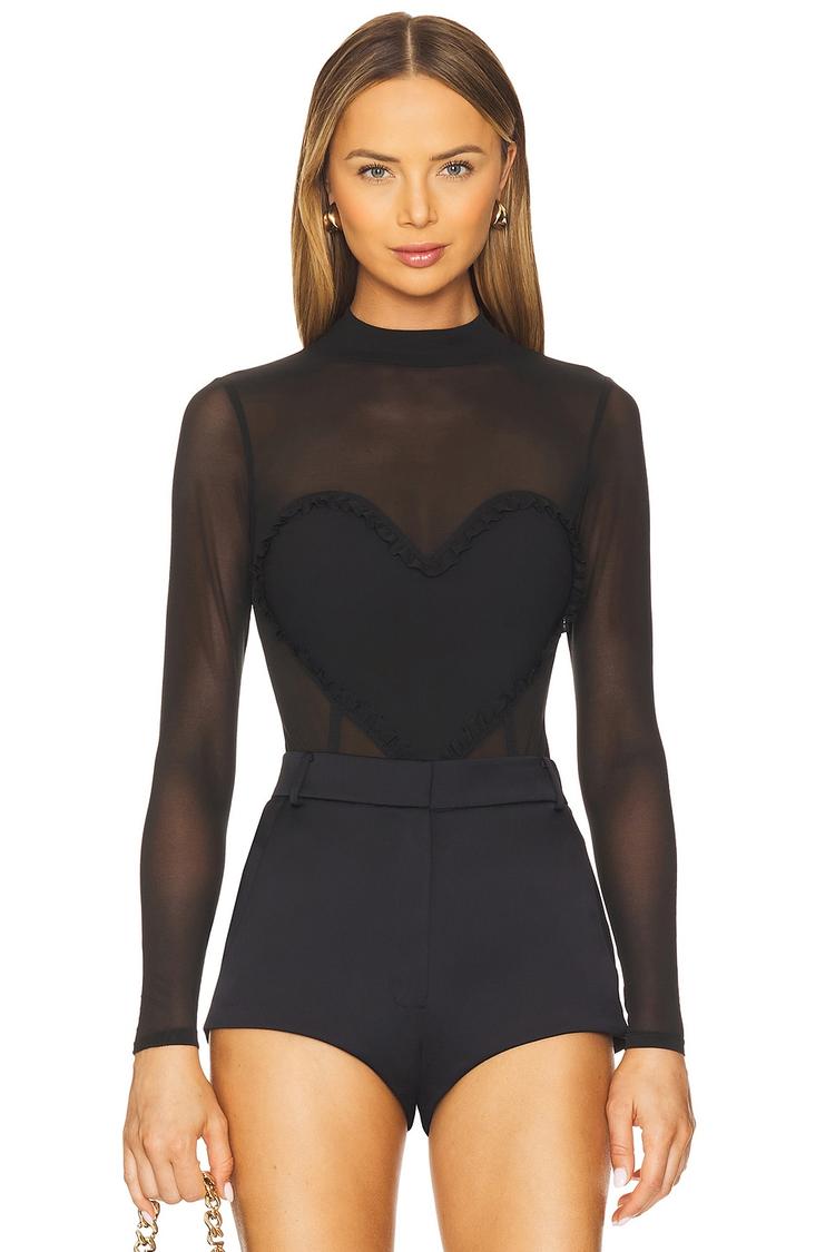 Lightweight sheer mesh and a close fit create a bold, modern bodysuit featuring a chic mock neck and long regular sleeves. The standout ruffle heart design on the front adds a sexy, elegant touch to this black piece, perfect for night out, cocktail events, or date nights. With a hidden back zipper and snap button gusset closure, it combines style with functionality while the sheer panels add a daring allure. Crafted from nylon, elastane, and cotton for comfort and stretch, this bodysuit elevates your evening wardrobe with effortless sophistication.