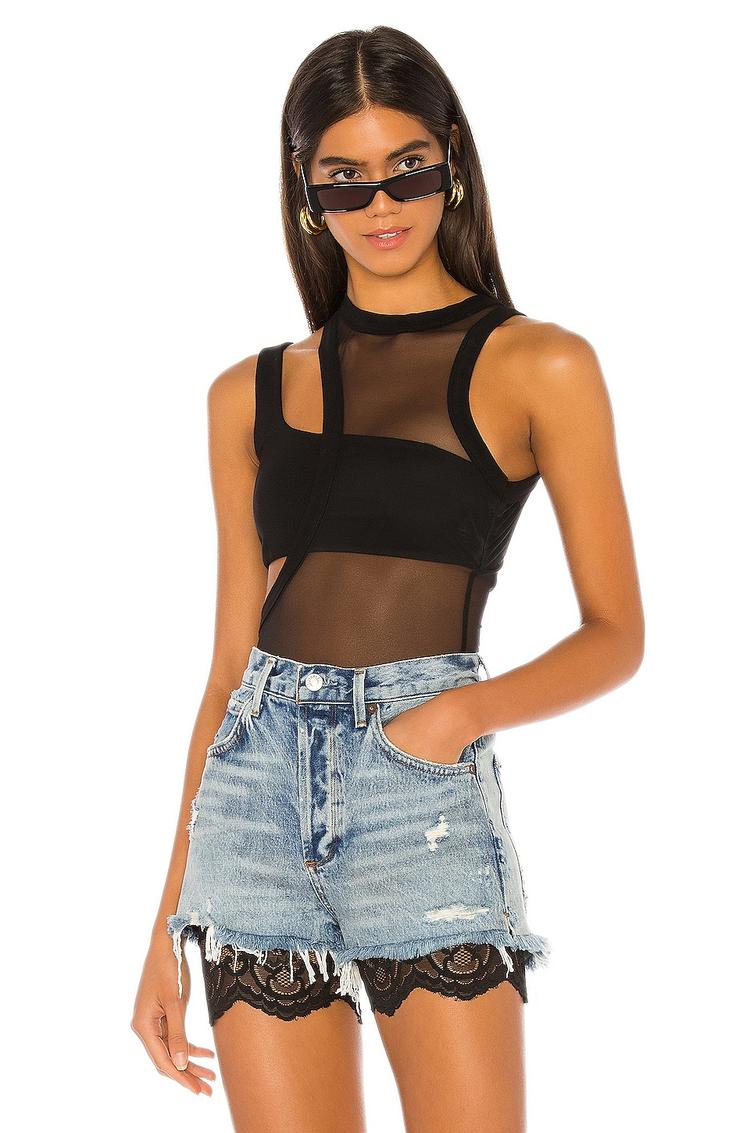 Sheer mesh panels blend seamlessly with ponte jersey fabric in this fitted bodysuit featuring a high neck and wide straps. The cropped length and sleeveless design emphasize an edgy, modern silhouette ideal for spring and summer. Functional bottom snap button closure ensures easy wear, while the solid black color adds versatile sexiness. Perfect for casual days, brunch dates, or night outs, this bodysuit pairs effortlessly with denim or skirts for a confident, fashion-forward look.