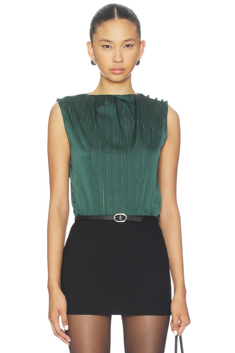Metallic dark green satin with subtle all-over stripes creates a sophisticated and elegant vibe in this fitted bodysuit. Featuring a sleeveless design with wide straps and a classic round neckline, it offers a smooth waist-length silhouette perfect for layering or standalone styling. Button loop-closures at the shoulders and a snap-button gusset ensure ease of wear. Ideal for casual days, business casual settings, or night outs, this midweight polyester-spandex blend combines comfort with a refined shimmer, making it a versatile addition to your wardrobe.