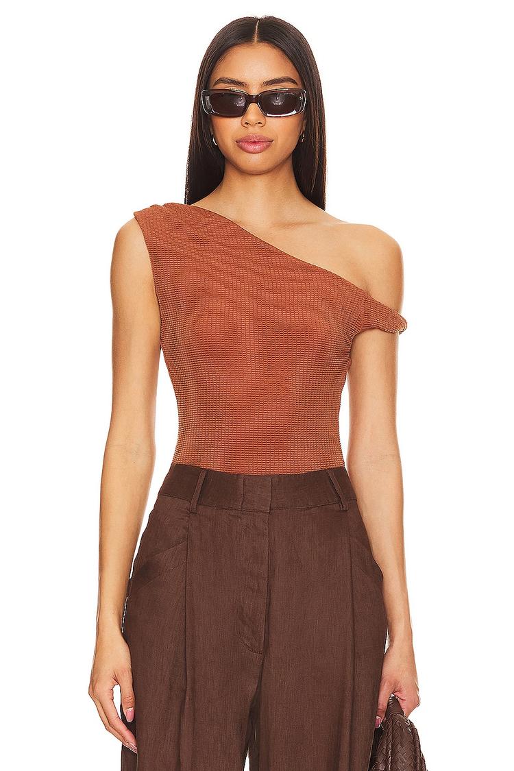 Feel the warm glow of summer in the Lera Bodysuit by House of Harlow 1960 x REVOLVE. This one-shoulder, ribbed jersey bodysuit in a rich terracotta-orange flatters with a sleek, curve-skimming silhouette. Crafted from a nylon-spandex blend for premium stretch and a soft touch, it hugs the body in a flattering Bodycon fit. The back is thong, offering minimal coverage for a seamless look with high-waist bottoms. Wear it alone with tailored pants for a night out, or dress it down with wide-leg trousers for vacation chic. Easy to care for with hand wash instructions.